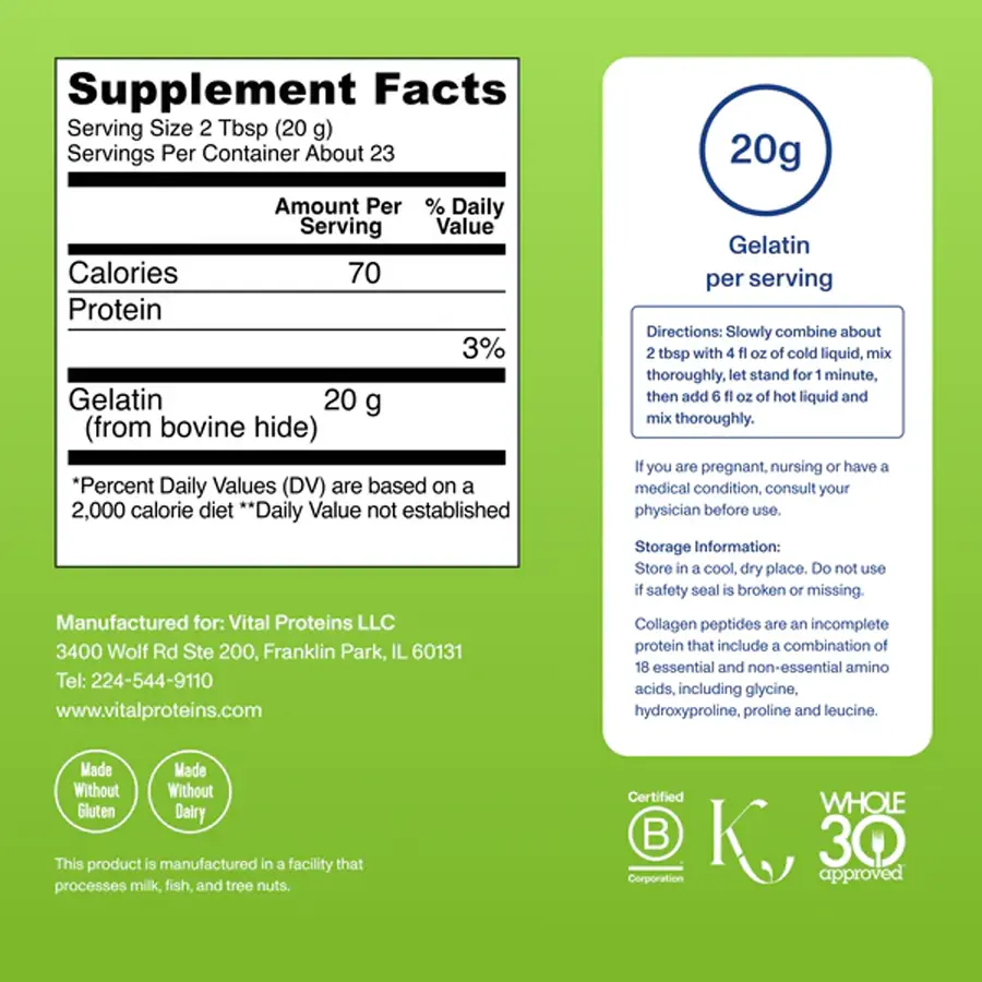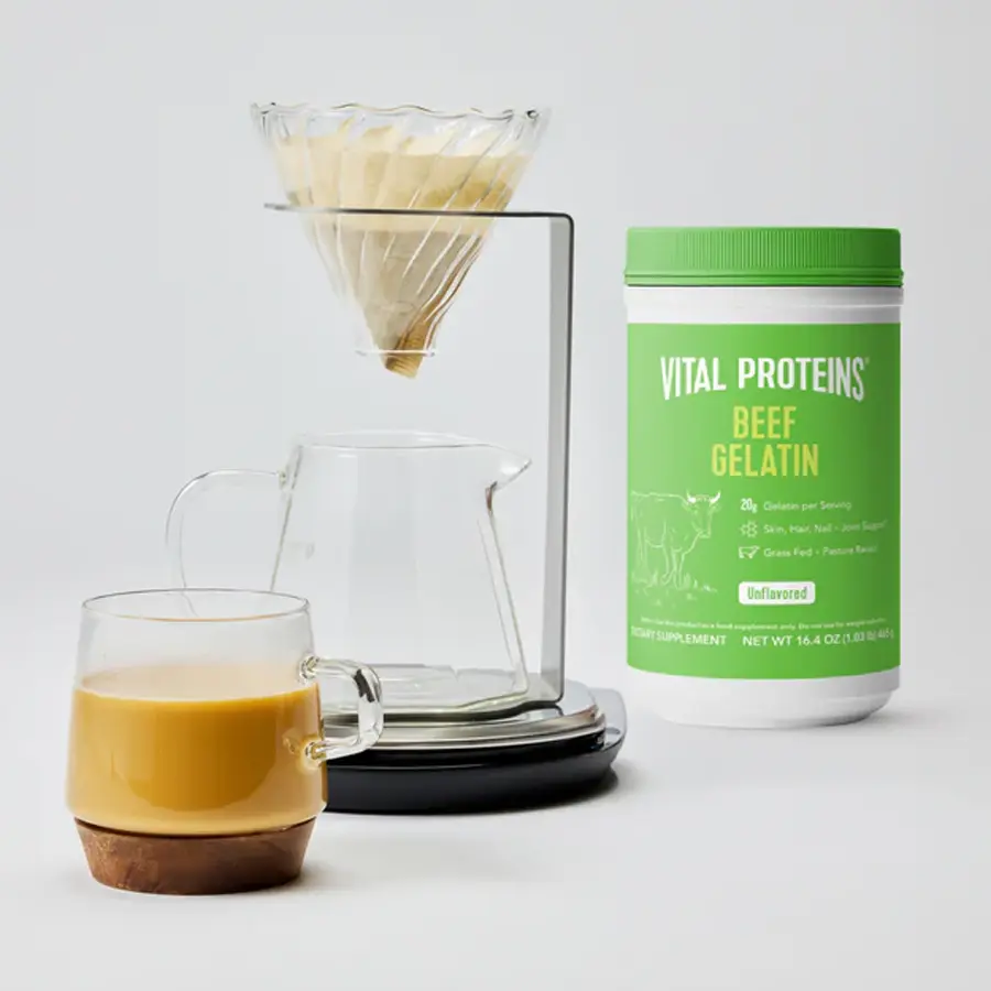 Beef Gelatin de Vital Proteins® es una gelatina pura obtenida de las pieles de ganado bovino alimentado con pasto y criado en libertad.