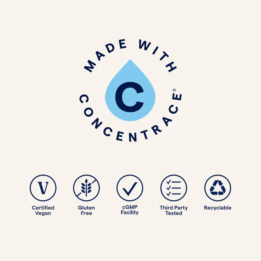 - ConcenTrace® Trace Mineral Complex: Mezcla completa de minerales traza iónicos que apoya el balance mineral del cuerpo y favorece la absorción de nutrientes.