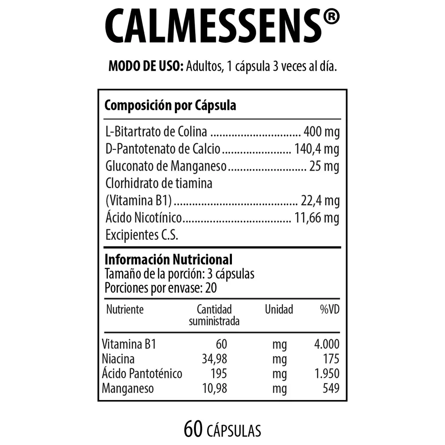 CALMESSENS® es un suplemento dietario formulado con vitaminas del complejo B y minerales esenciales que complementan la alimentación diaria.