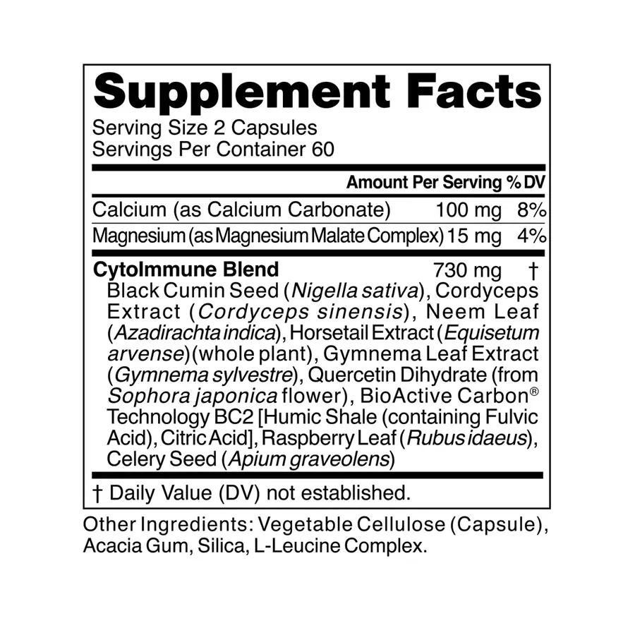 CytoImmune reúne ingredientes como Nigella sativa, quercetina, extracto de cordyceps, neem y cola de caballo, entre otros, que actúan de forma sinérgica para fortalecer las defensas, modular la inflamación, apoyar la función pulmonar y promover una respuesta eficaz frente a los desafíos modernos.