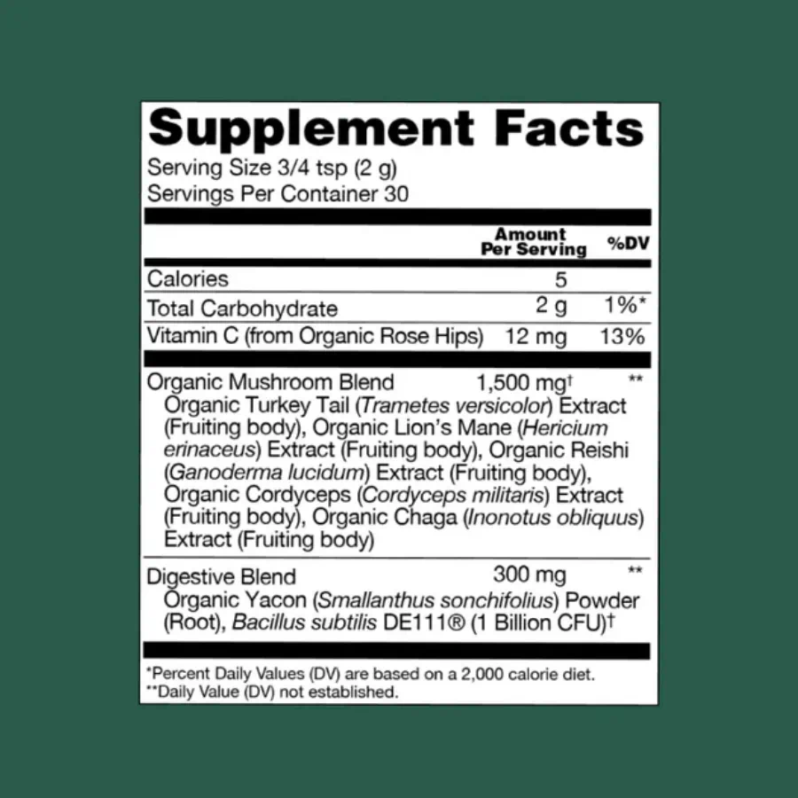 - Refuerza las defensas naturales con potentes hongos inmunomoduladores