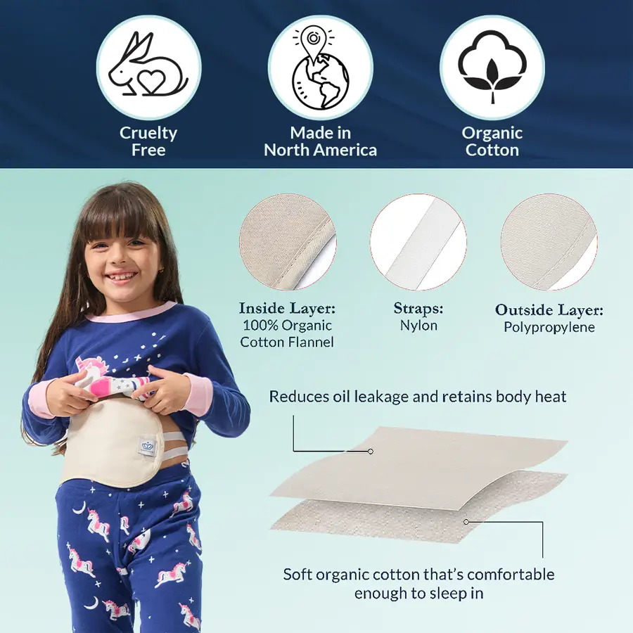 - Capa interna (100% algodón orgánico): Suave, de alta calidad y sin blanquear. Es la superficie que entra en contacto con la piel y el aceite de ricino.