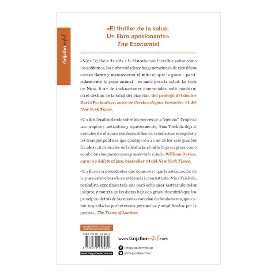 El libro analiza cómo las guías de salud pública adoptaron la demonización de la grasa (especialmente la grasa saturada) y cómo esto influyó en los hábitos alimentarios de millones de personas. Teicholz plantea la posibilidad de que estas recomendaciones hayan contribuido a algunos de los problemas de salud actuales, invitando al lector a reevaluar lo que considera una “alimentación saludable”.
