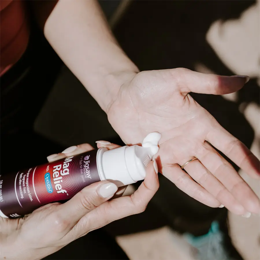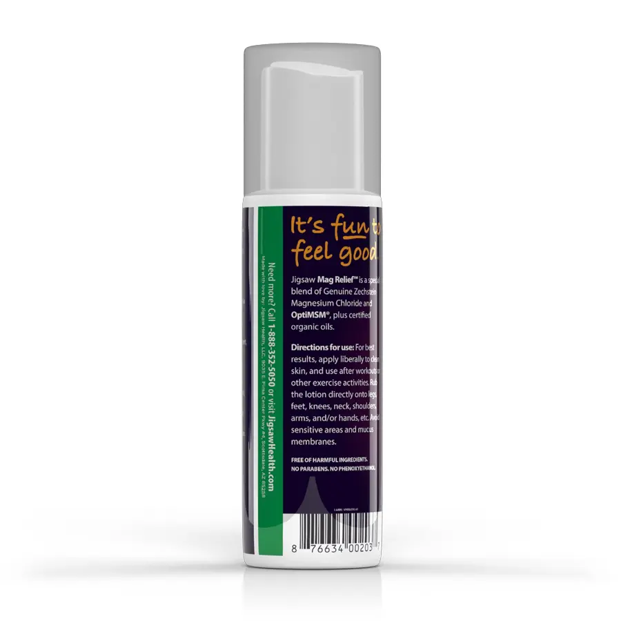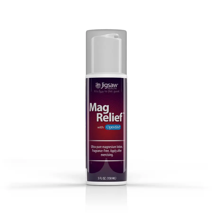 Jigsaw MagRelief™ combina magnesio cloruro Genuine Zechstein, OptiMSM® y aceites orgánicos en una fórmula tópica diseñada para usarse después del ejercicio o cuando necesites una sensación de alivio y relajación muscular.