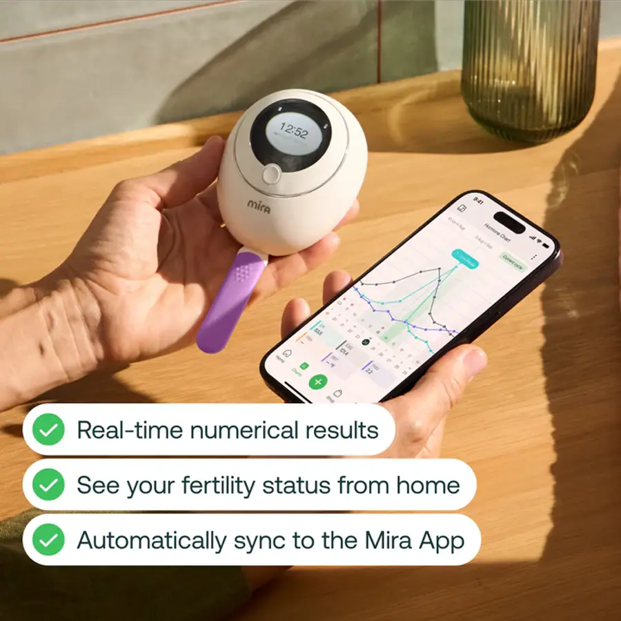 - El monitor leerá tu información hormonal y la enviará automáticamente a la Mira App, donde tendrás gráficas y seguimiento personalizado