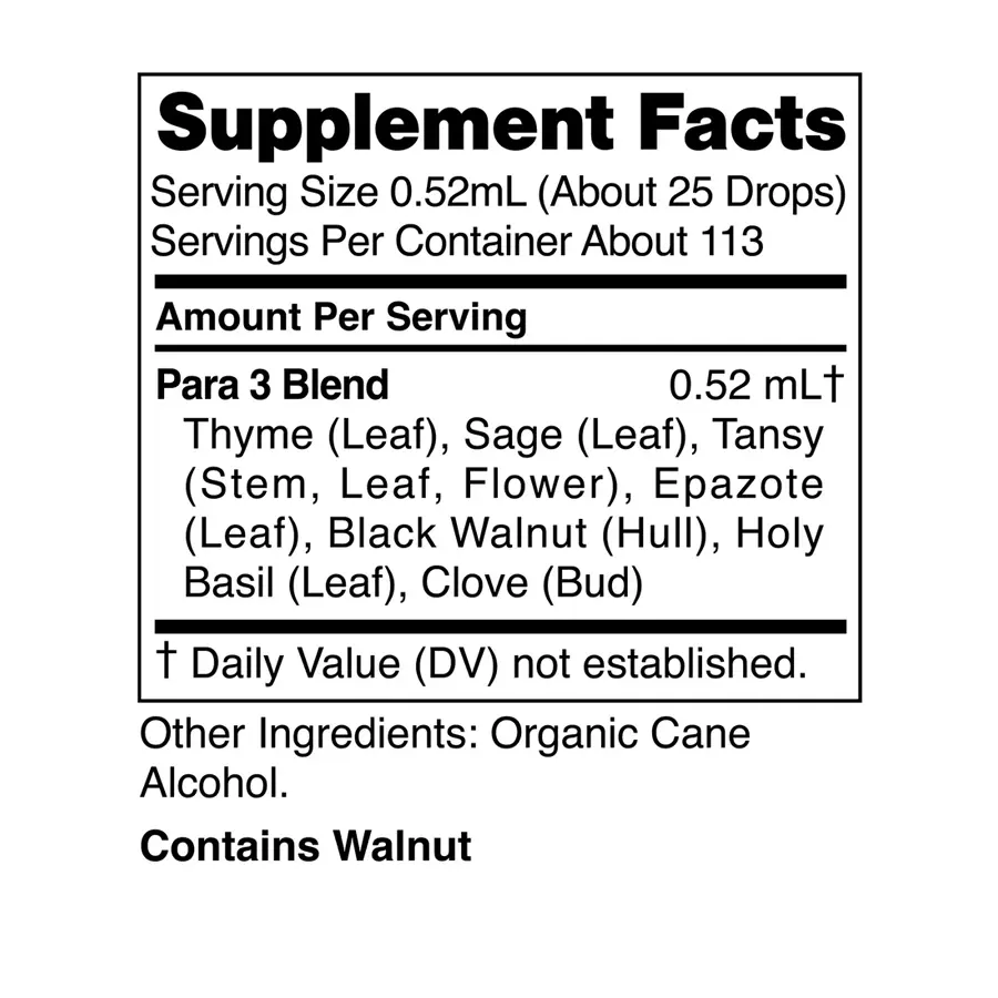Para 3 es una fórmula líquida concentrada que combina siete hierbas, entre ellas clavo, cáscara de nogal negro y albahaca santa. Su sinergia botánica está diseñada para apoyar los procesos naturales de detoxificación, fortalecer el terreno intestinal y respaldar un microbioma equilibrado.